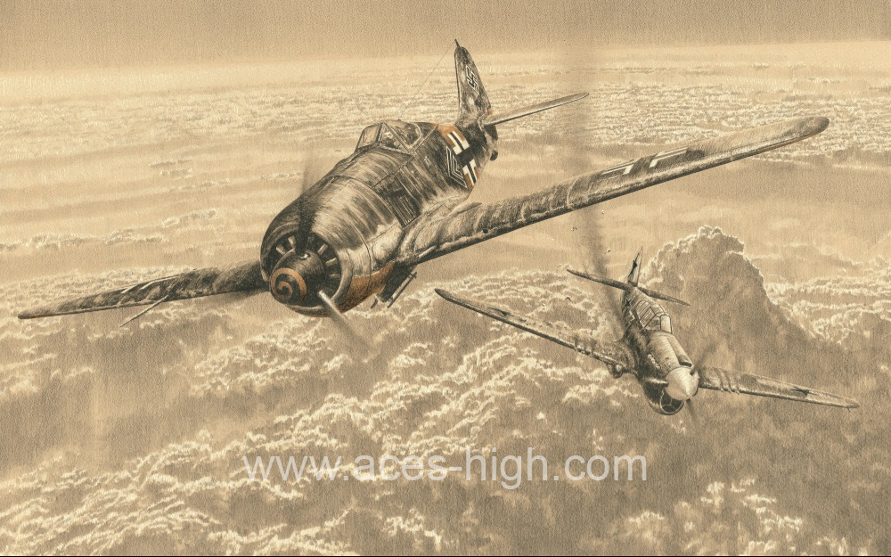 And he did it in style, as portrayed by Richard Taylor in his dramatic depiction of the encounter as Nowotny downs a Russian Curtiss P-40. Not only was the P-40 number 250 but the culmination of four victories in just twenty minutes!
