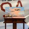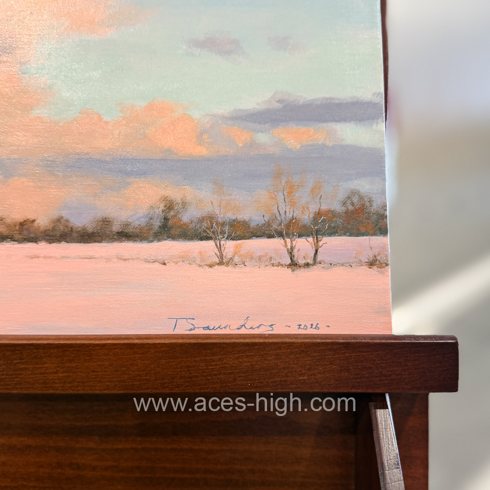 For this painting I wanted to depict two P51s flying low across a winter landscape. I knew red and silver would work perfectly, so I opted for Mustangs of the 4th Fighter Group. The main aircraft is that of Lt. Col. Jack Oberhansly, with his very particular nose art." - Anthony Saunders