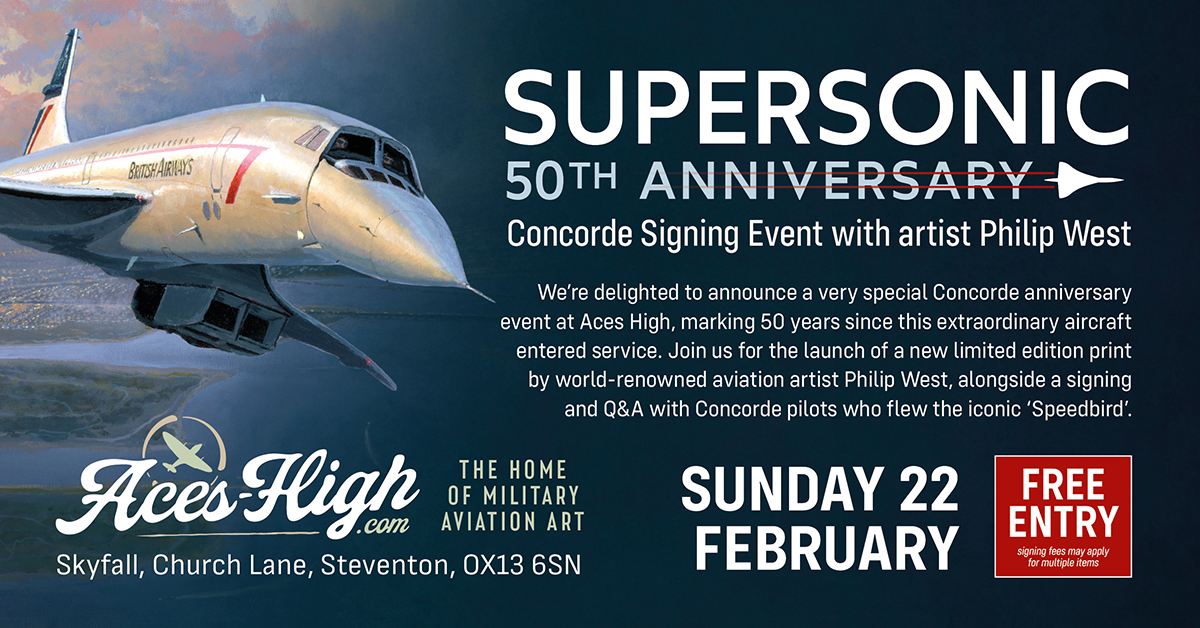 We’re delighted to announce a very special Concorde anniversary event at Aces High, marking 50 years since this extraordinary aircraft entered service. Join us for the launch of a new limited edition print by world-renowned aviation artist Philip West, alongside a signing and Q&A with up to six Concorde pilots who flew the iconic ‘Speedbird’.