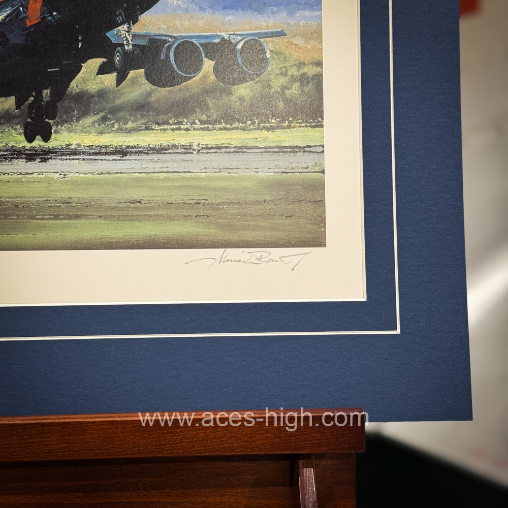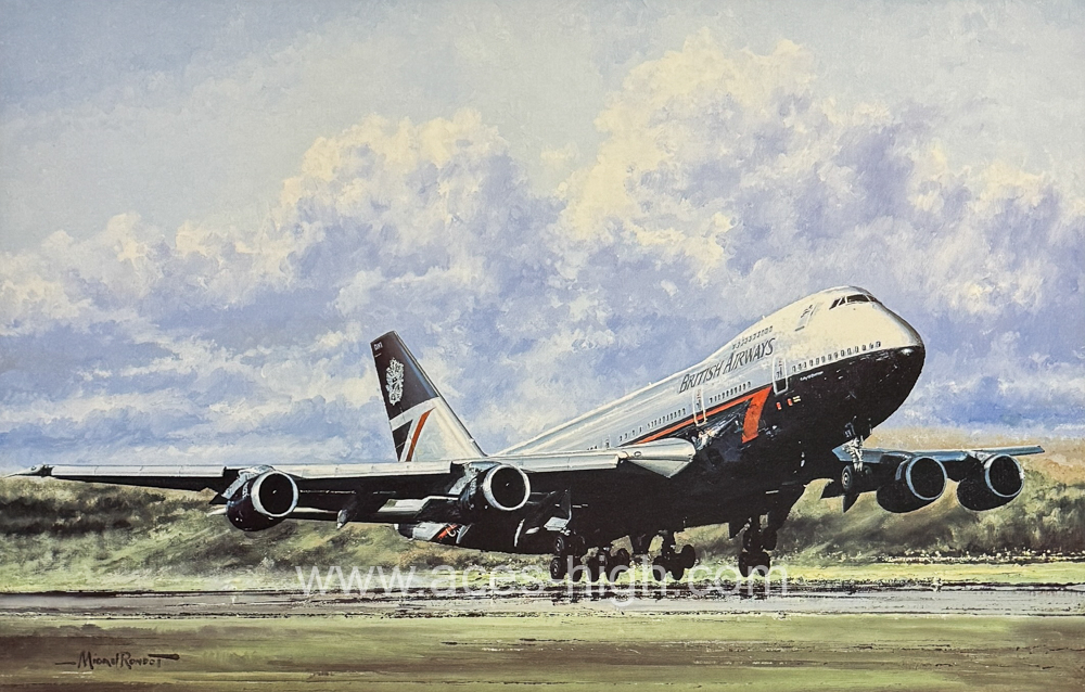 This detailed piece by Michael Rondot depicts the moment when a British Airways Boeing 747 Jumbo is hauling off Gatwick’s runway with a full load of passengers and fuel.