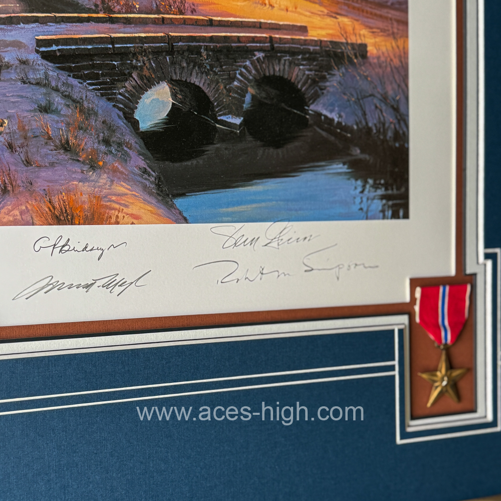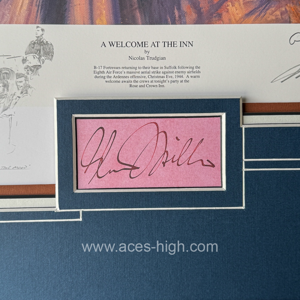 Personally signed by FOUR distinguished USAAF bomber pilots who flew the B-17 during World War Two. PLUS, conservationally framed to include the rare ORIGINAL autograph of Glenn Miller himself!