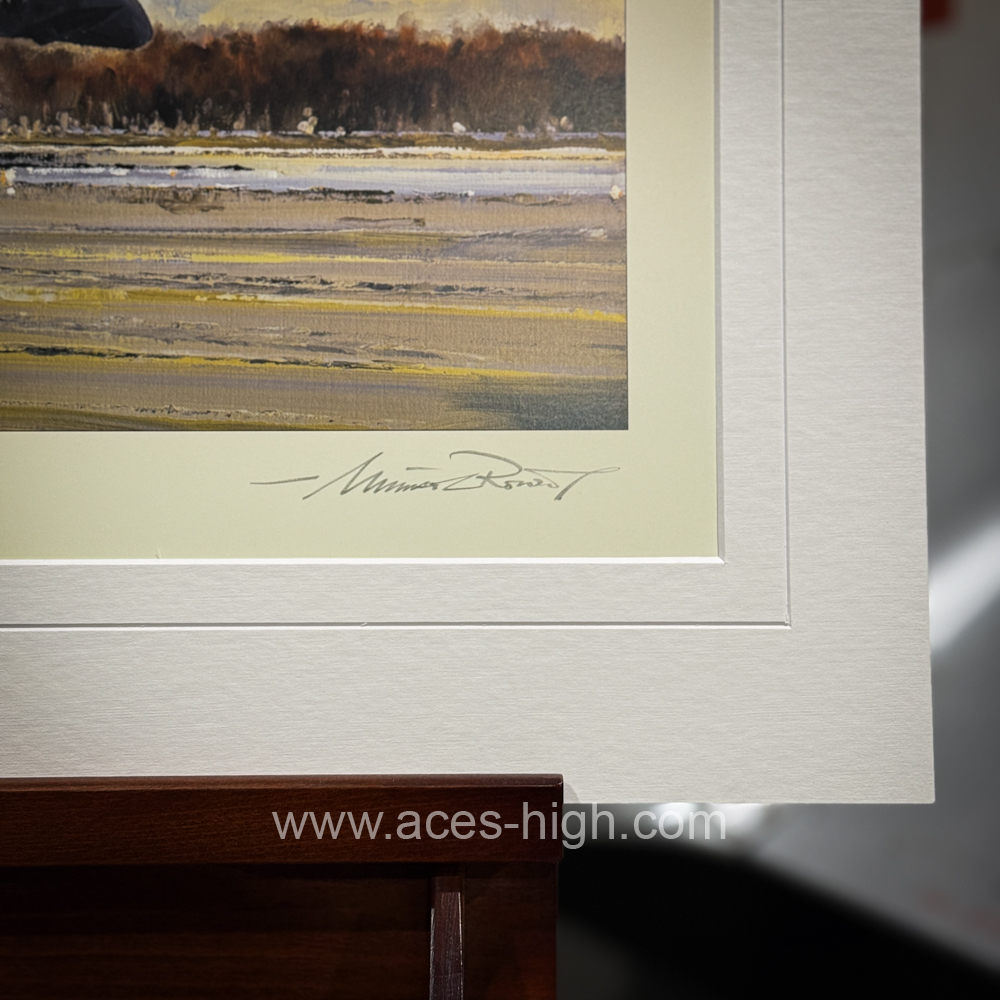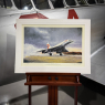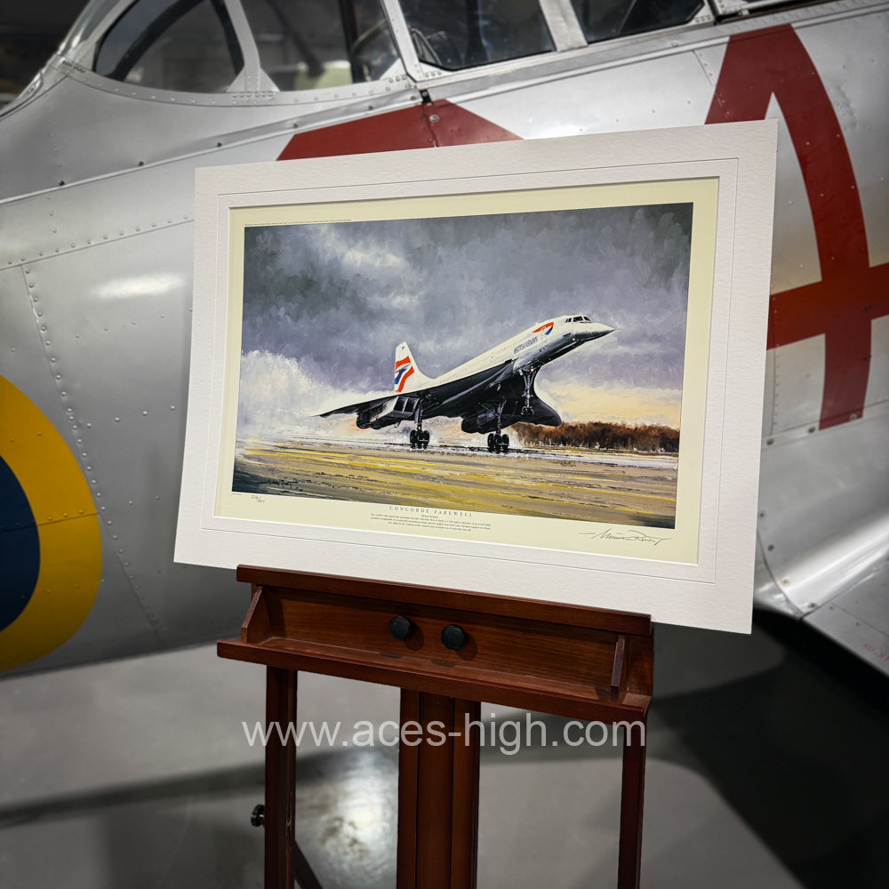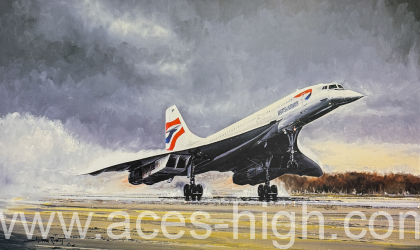 Combining grace and beauty with sheer awesome power, the unmistakable shape of Concorde is dramatically illustrated here in the style immediately recognizable as that of Michael Rondot. Concorde Farewell is a tribute to this amazing aircraft as she went into retirement in November 2003.