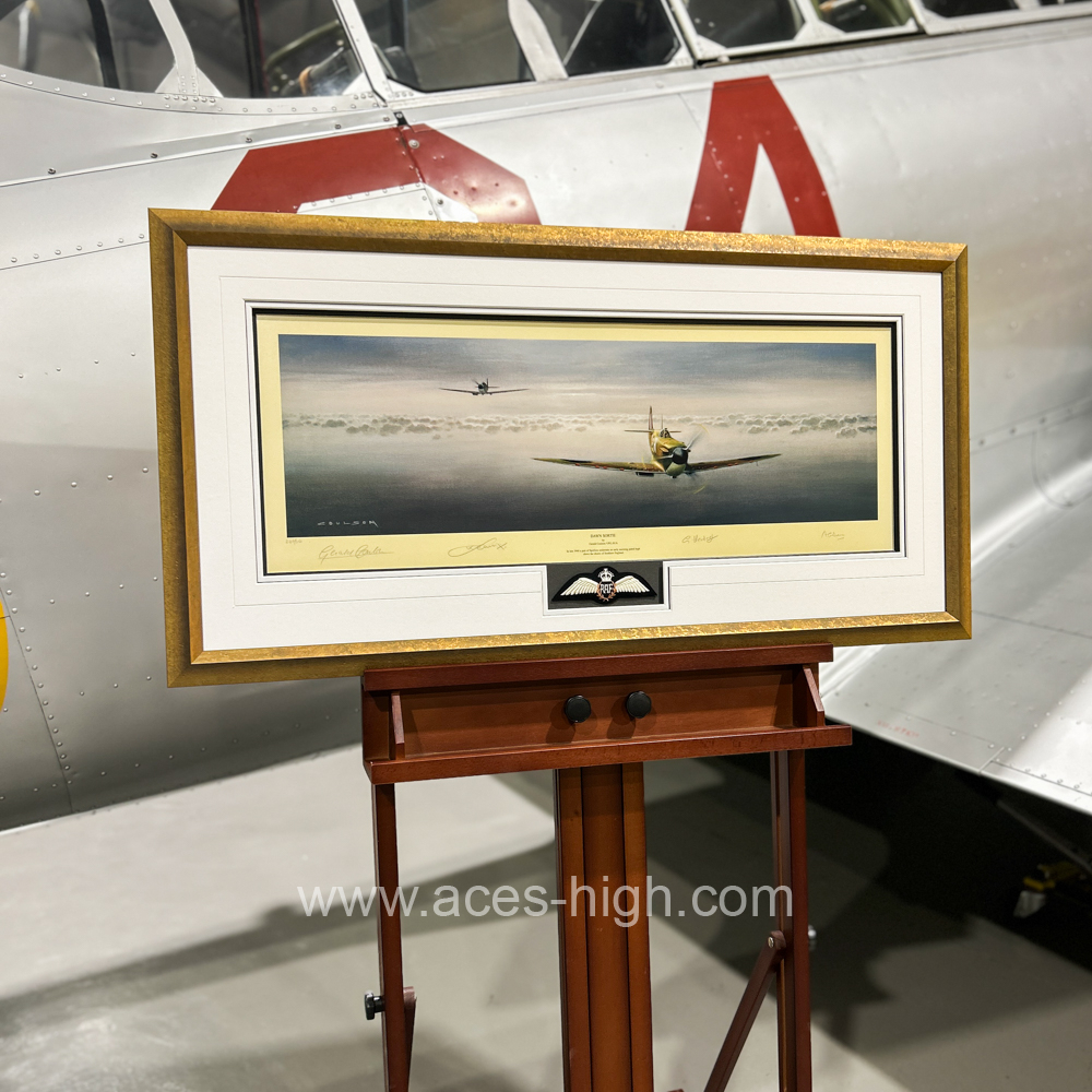 This magnificent tribute to the Spitfire is one of Gerald's best-loved pieces and was personally autographed on release in 2008 by three highly-regarded Spitfire pilots. Framed by our in-house team of expert framers this piece comes signed with the signatures of THREE veterans who flew during the Battle of Britain.