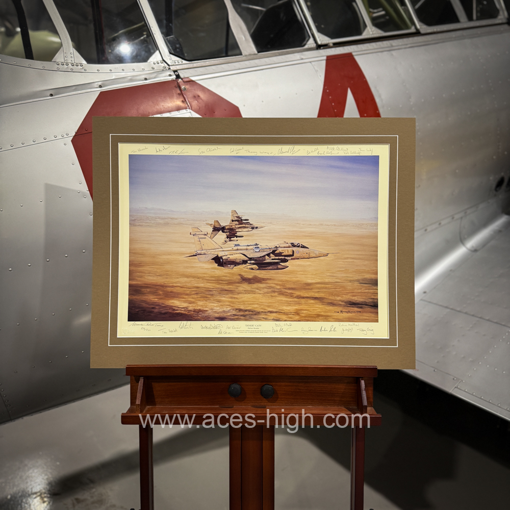 Michael Rondot's painting captures the speed and excitement of low-level operations as a pair of Jaguars loaded with 1000 lb Bombs and BL755 Cluster Bombs break formation and head down to the desert floor on a typical sortie. Each print in the edition is individually signed by 25 pilots from the RAF Coltishall Jaguar squadrons including all 3 squadron commanders. It is a great tribute to the engineers, pilots and the Jaguar aircraft itself, which proved so reliable and effective during these Operations.