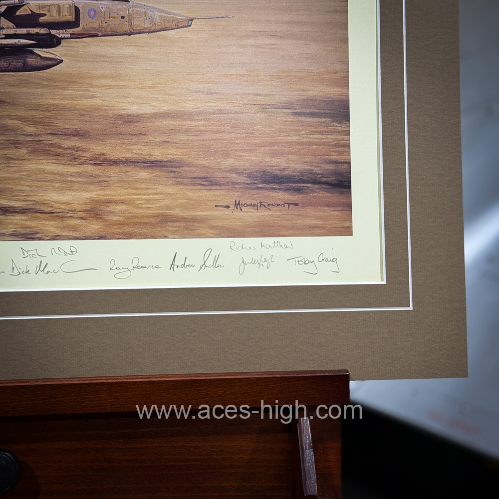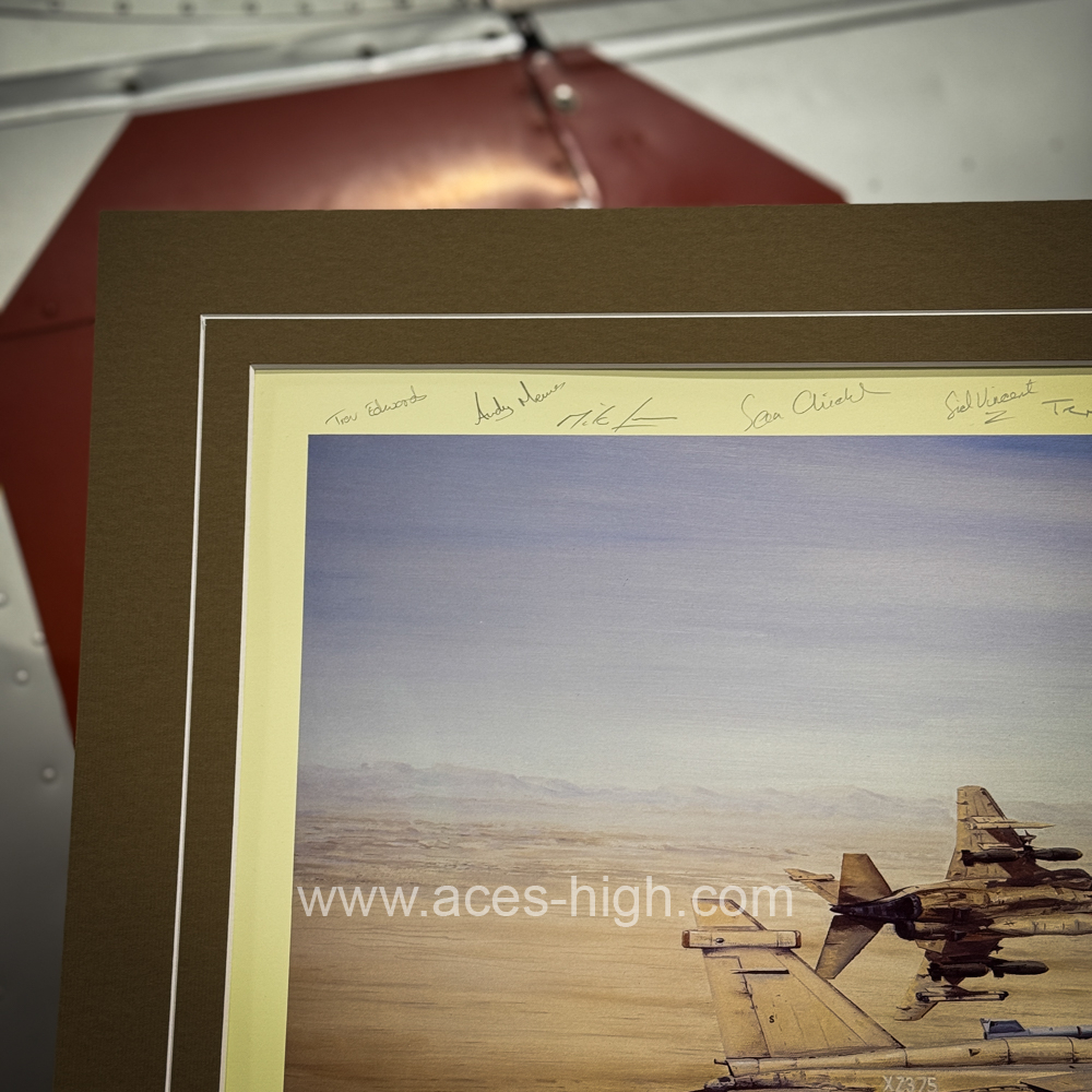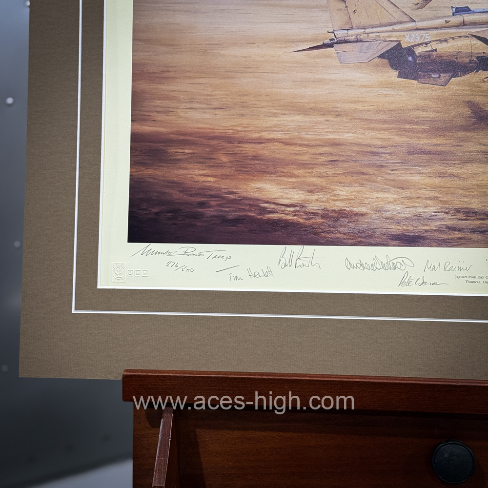 Each print in this edition has been signed by the artist (and Jaguar pilot) Michael Rondot but also a staggering TWENTY-FOUR Jaguar pilots who flew on Operation GRANBY, Operation DESERT STORM and Operation WARDEN.