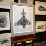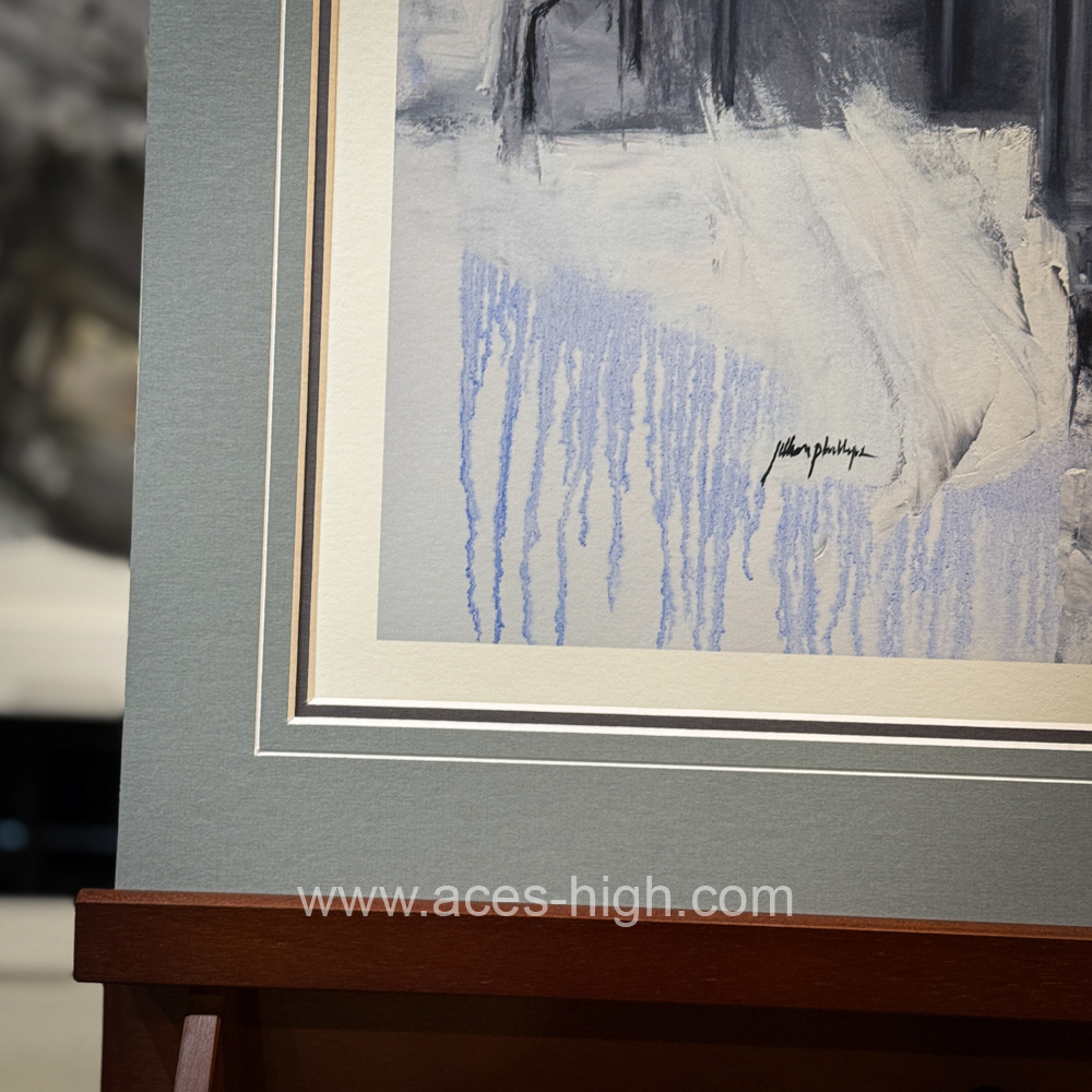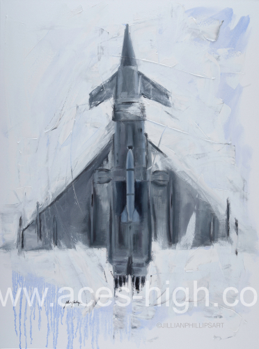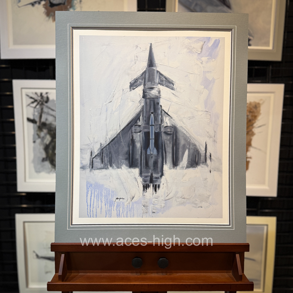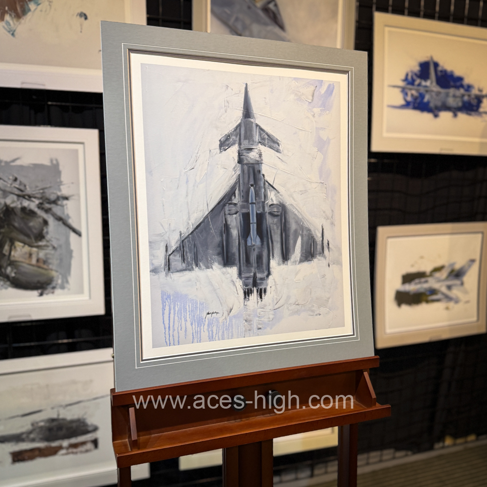 his Eurofighter Typhoon print showcases the aircraft with dynamic energy, brought to life through the bold textures of palette knife work combined with the precision of brushstrokes. The palette knife creates sharp, angular highlights and rugged details on the fighter’s sleek body, enhancing its aerodynamic form and metallic sheen. In contrast, the brush adds smooth gradients and subtle shadows that capture light and movement, giving depth to the background sky and emphasizing the aircraft’s powerful presence. Together, these techniques convey both the Typhoon’s cutting-edge technology and the intensity of its mission in a striking, tactile composition.