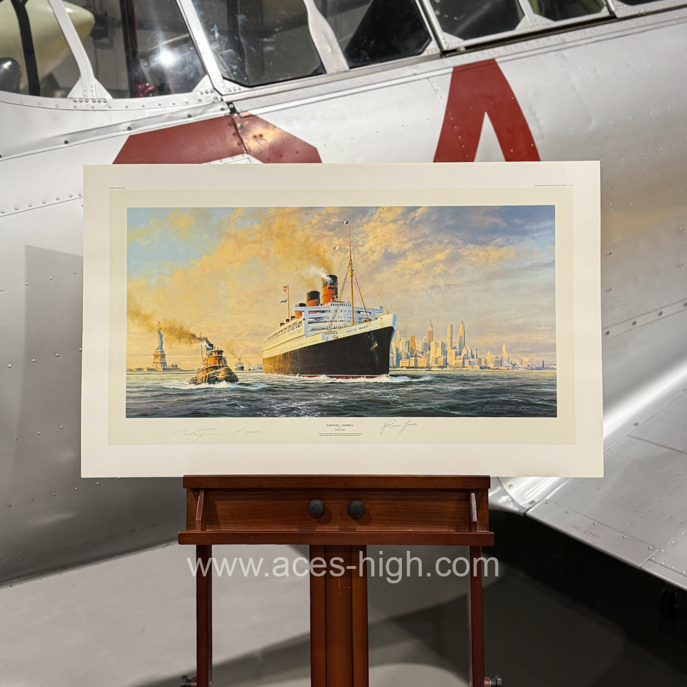 Robert Taylor masterfully recreates a scene from the great ship's illustrious past, as she sails from New York or Europe in the early post-war period. Alive with beauty, energy and strength, the QUEEN MARY steams majestically past the Statue of Liberty, her bows pointed eagerly towards the Atlantic.