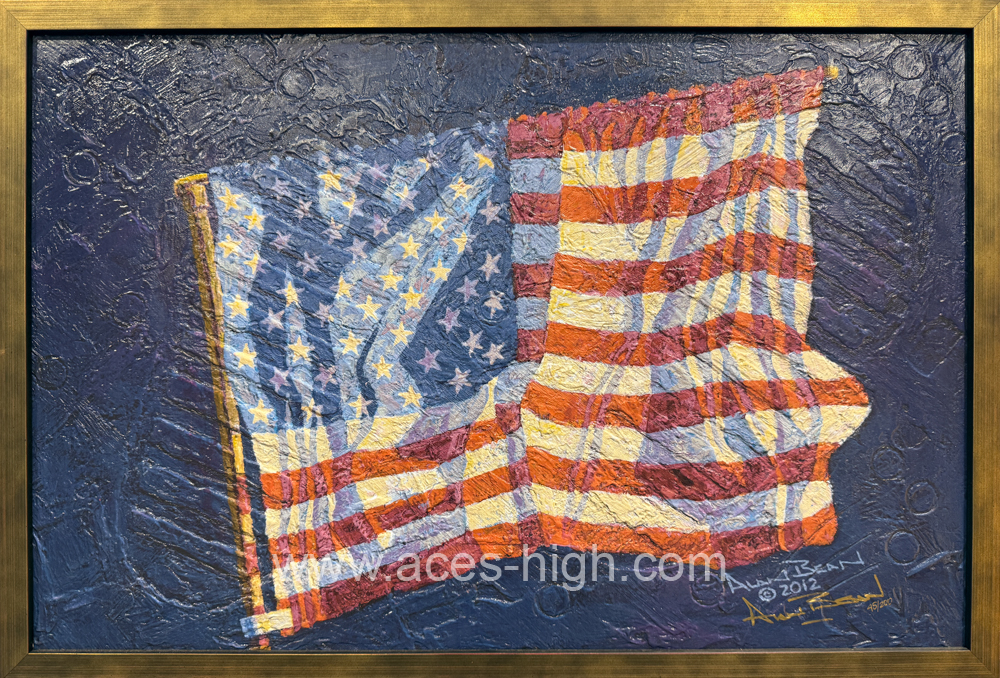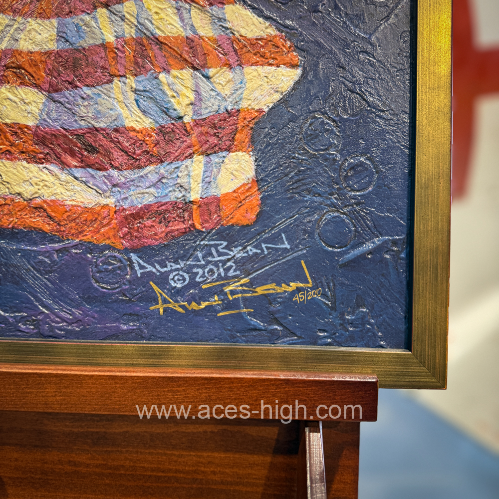 This piece is a Limited Edition Giclee which is very different from other Giclees as this one has the foot prints of Alan's boots he wore on his missions which gives a Three Dimensional feel to this piece! This piece has been Signed and numbered by Alan himself!