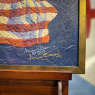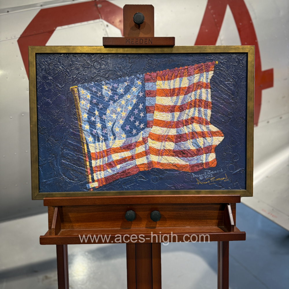 In this piece the first flag is hanging just like a curtain would from a small extendable metal pole which Neil rotated and locked into place on top of the flagstaff. The flag itself had been stored, folded up accordion-style, and attached to the flagstaff and curtain rod, just prior to launch. He and Buzz then attempted to extend the rod and flag to its full length but without complete success. The creases in the shortened flag are still visible in Bean’s painting.