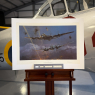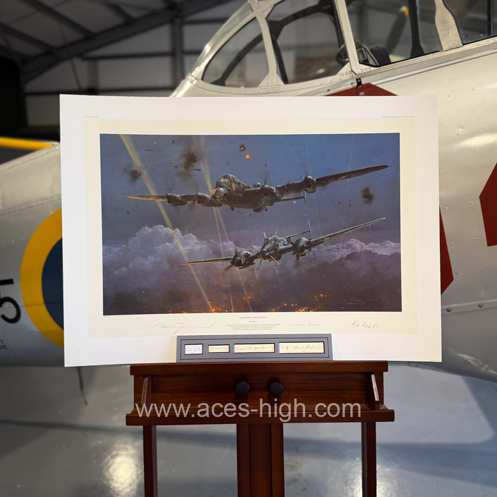 Some pieces are very special; they possess a magic ingredient that is almost beyond definition. It’s sometimes called the ‘it’ factor, an unknown formula that results in a touch of brilliance. Lancaster under Attack is one such piece, combining, as it does, a brilliant composition, an emotive story and some very special signatures.Night scenes are notoriously difficult to paint but here the artist achieves a perfect composition, brilliantly using the moonlight to illuminate the two combatants whilst the glare of searchlights, burning fires and exploding shells puncture the night sky with iridescent golden hues.