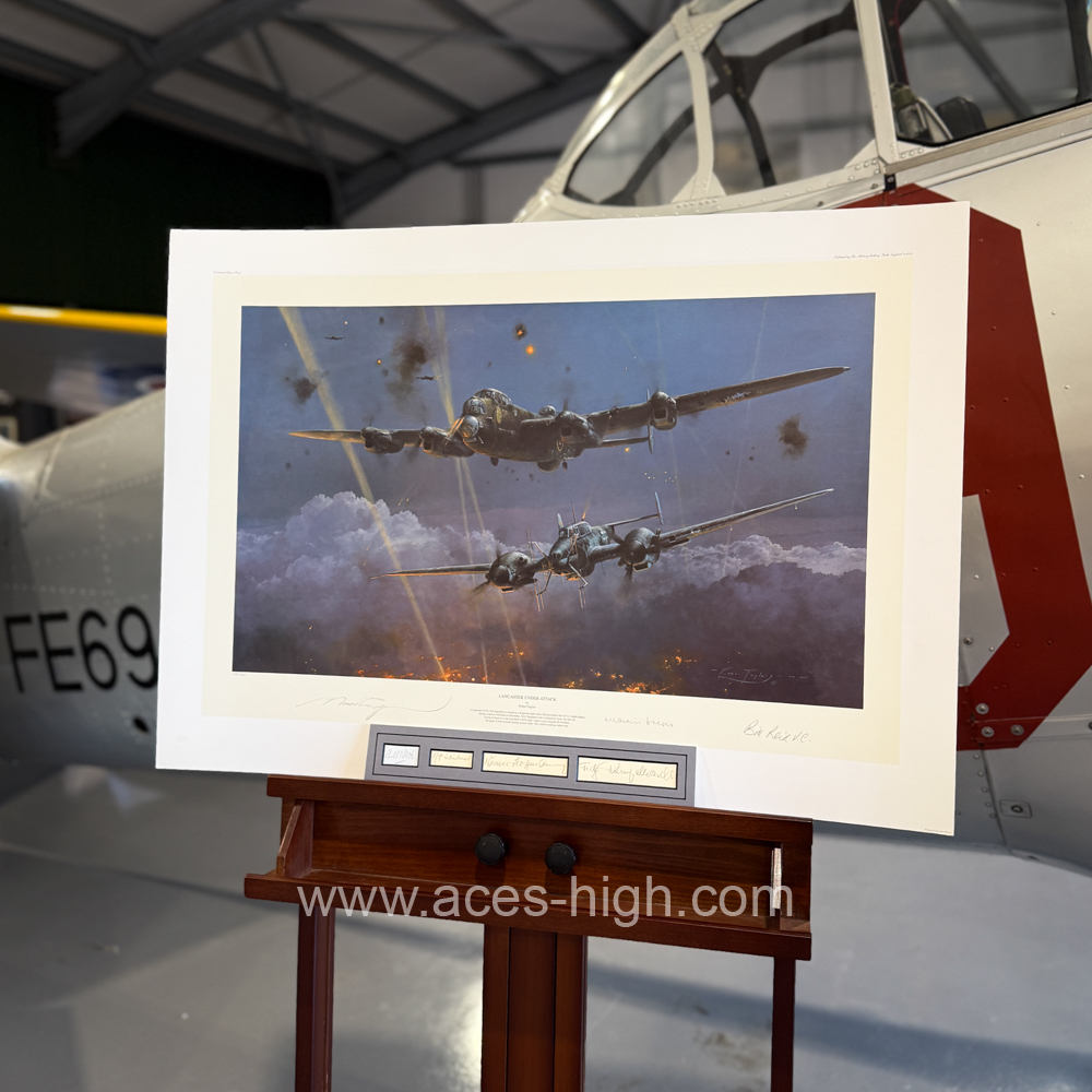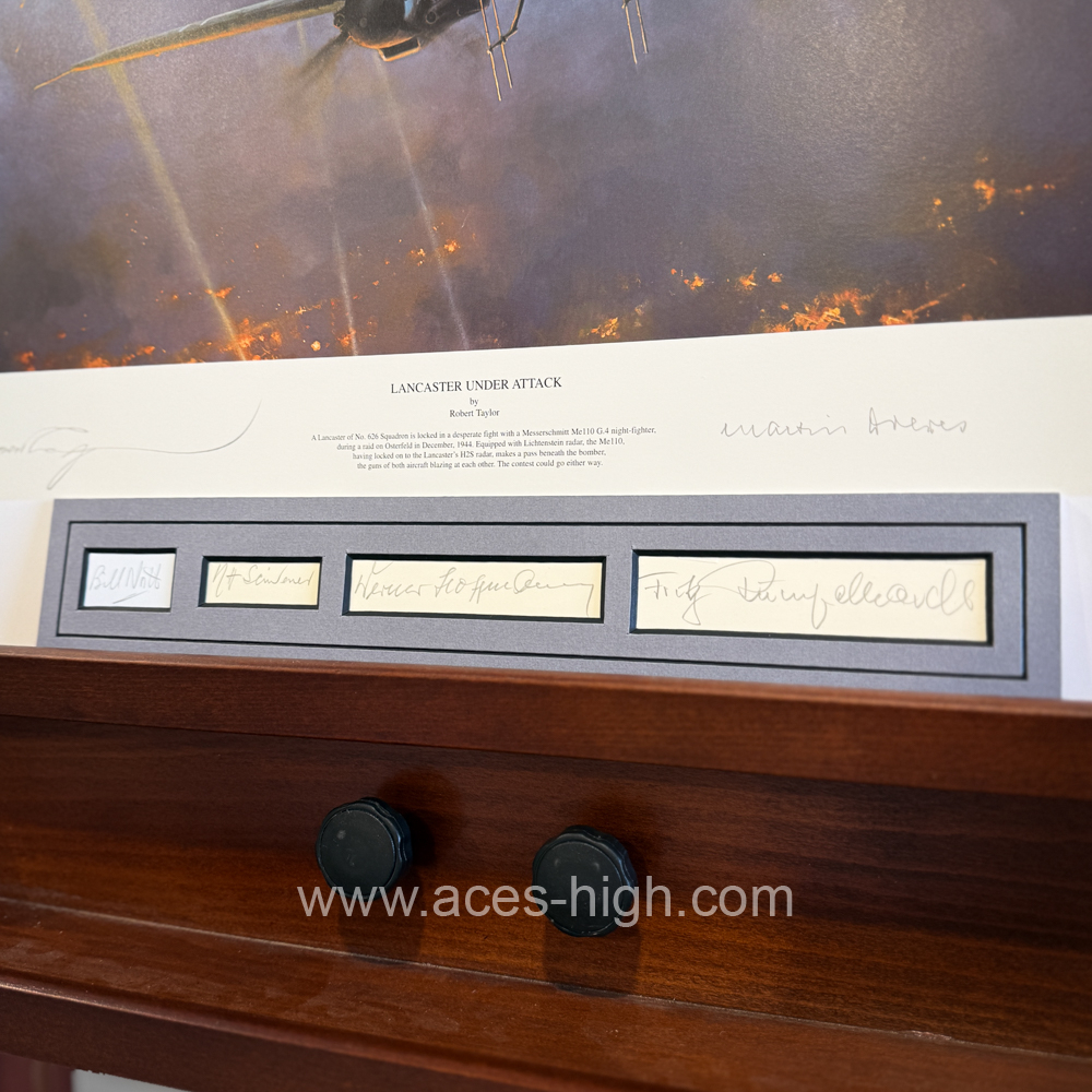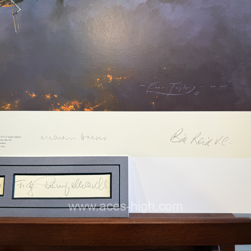 The painting sets the scene in the night skies over Osterfeld during a raid carried out in December 1944. The Lancaster, from 626 Squadron, is forced to take evasive action as an Me110 G-4 night-fighter make a close pass beneath it. Both crews are locked in a desperate duel as they bid to manoeuvre each other. The Lancaster, hampered by damage, jinks through the darkness whilst the Me110 pilot dives away to avoid the stream of tracer emanating from the Lancaster’s front turret. The contest could go either way.The last factor in the success of Lancaster under Attack came from the two highly decorated pilots from opposing sides who came together in mutual respect to sign the prints. Lancaster pilot Flight Lieutenant Bill Reid was awarded the Victoria Cross when, seriously injured by gunfire following attacks by Me110 and Fw190 night-fighters, pressed on for another 200 miles, bombed the target, and although weakened from loss of blood, somehow got his surviving crew safely home. Major Martin Drewes, on the other hand, was one the most formidable Luftwaffe night-fighter pilots who, between 1941 and 1945, completed 235 combat missions in the Me110 and achieved 52 aerial victories. In 1944 he was promoted to command III./NG1 and was holder of the Knight’s Cross and Oak Leaves.