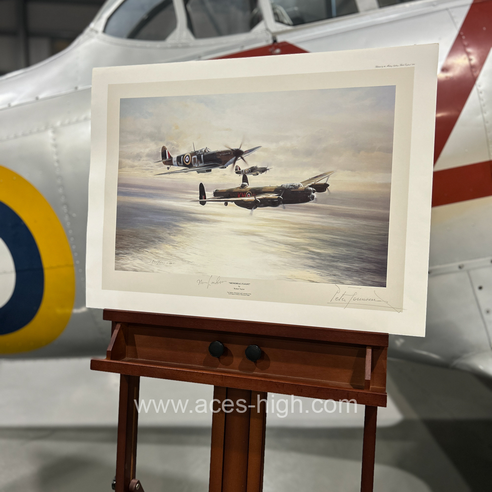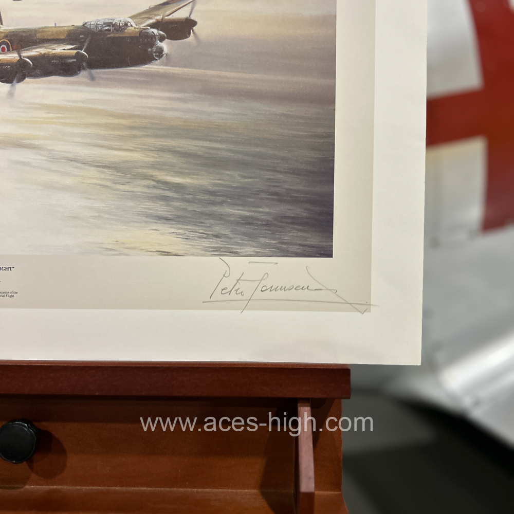 Formed in 1957, the RAF’s Battle of Britain Memorial Flight remains one of the world’s great ‘flying museums’, a proud tribute to Britain’s military aviation heritage. As well as the five Spitfires and two Hurricanes, the Flight contains one of only two airworthy Lancasters in the world. Although numerous photographs have been taken of the Memorial Flight, few artists have succeeded in capturing the ‘essence’ of the three most important World War II aircraft as Robert Taylor has achieved with this wonderfully evocative portrayal of the Memorial Flight flying in formation over the English Channel, the late afternoon sun glinting on the sea below.