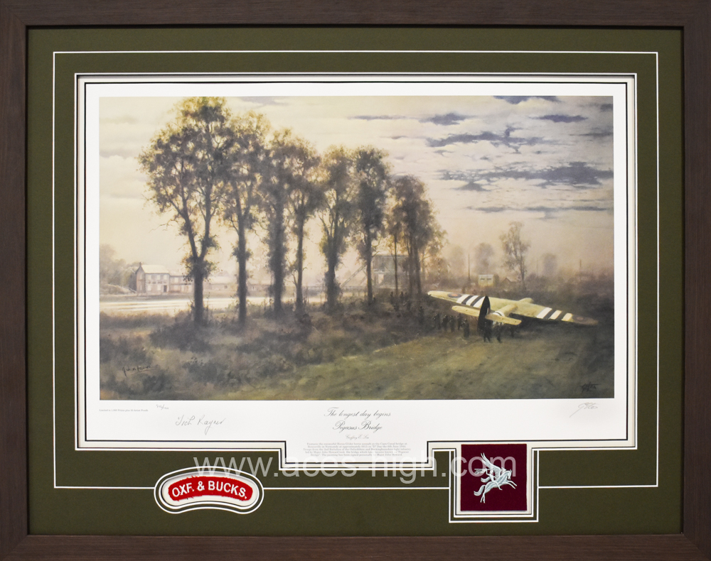 It's not often we're able to offer this moving piece. Framed to full conservation standards, our expert team have included patches of the Ox & Bucks and Winged Pegasus insignia as worn by the 6th Airborne Division, and to make it even more special it has been signed by a veteran of Pegasus Bridge who landed in Glider No.4: