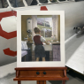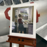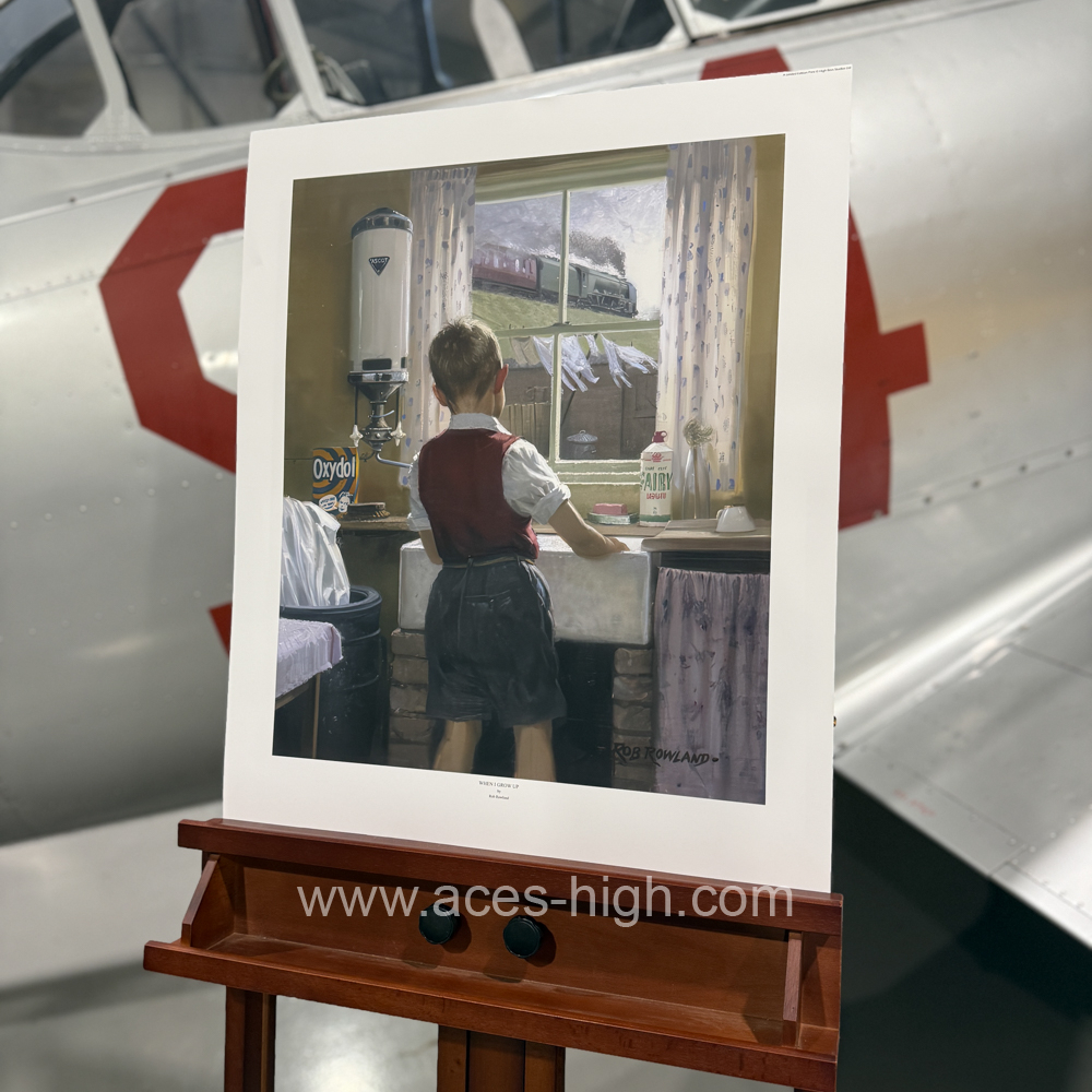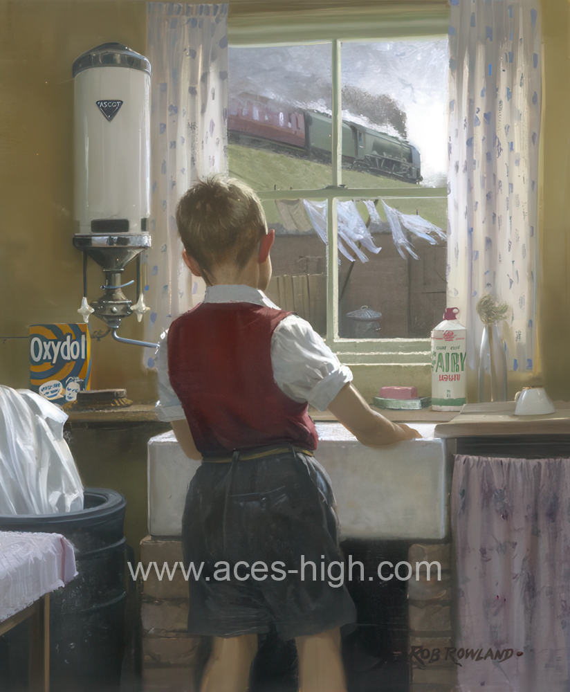This piece depicts a young boy peering out of the window whilst completing his daily chores watching a stunning stream train roll on by not far from the house he lives in.