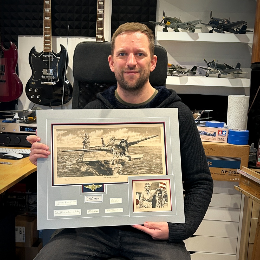 The historical importance of this restricted edition is highlighted by the inclusion of the extremely RARE and hard-to-come-by ORIGINAL autograph of Butch O’Hare himself which has taken a number of years to source and collect. Alongside is a completely separate portrait of O’Hare, museum-quality reproduction U.S. Naval Aviator Wings and the original autographs of a further five veterans who all flew Gruman F4F Wildcats with the U.S. Navy during World War Two, all saw action in the Pacific Theatre, and all finished the war having achieved Ace status with at least five confirmed victories over enemy aircraft. They include Alex Vraciu who at times flew as wingman to O’Hare and later became one of the foremost Aces in the USN with 19 victories, plus Hamilton ‘Mac’ McWhorter III who was the first USN carrier-based Double-Ace.