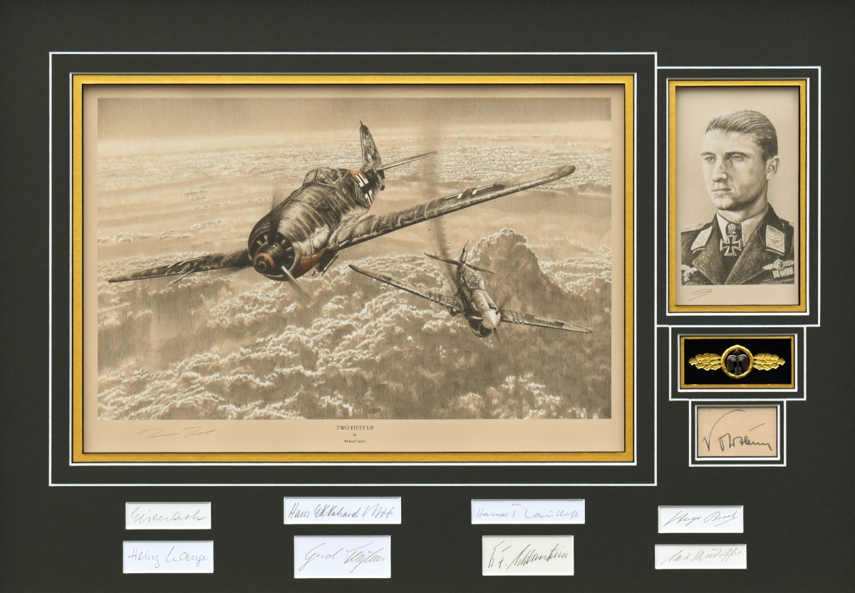 That historic moment is captured by Richard Taylor in a dramatic depiction of Nowotny’s encounter with a Soviet Curtiss P-40. Not only was the P-40 number 250 but the culmination of four victories in just twenty minutes! Faithfully reproduced as a high quality giclée fine art print on archival paper, each copy hand-numbered and personally signed by Richard Taylor. Alongside the print are original autographs from nine JG 54 fighter pilots, all confirmed aces, including the exceptionally rare signature of Walter Nowotny.